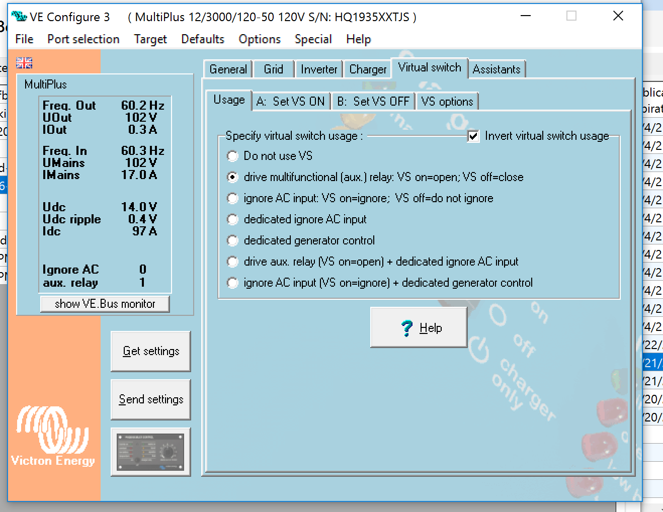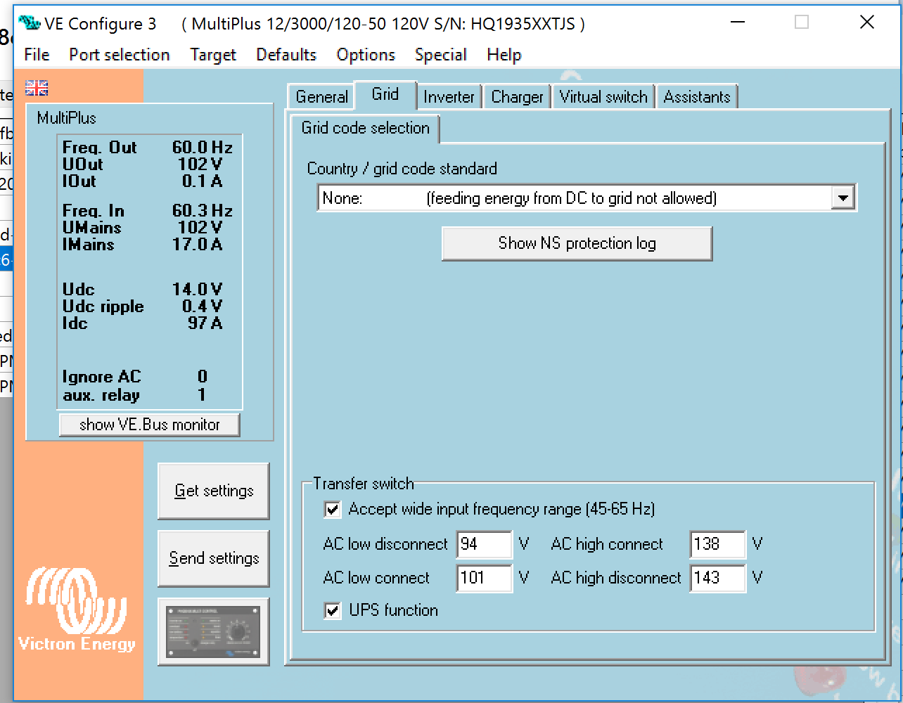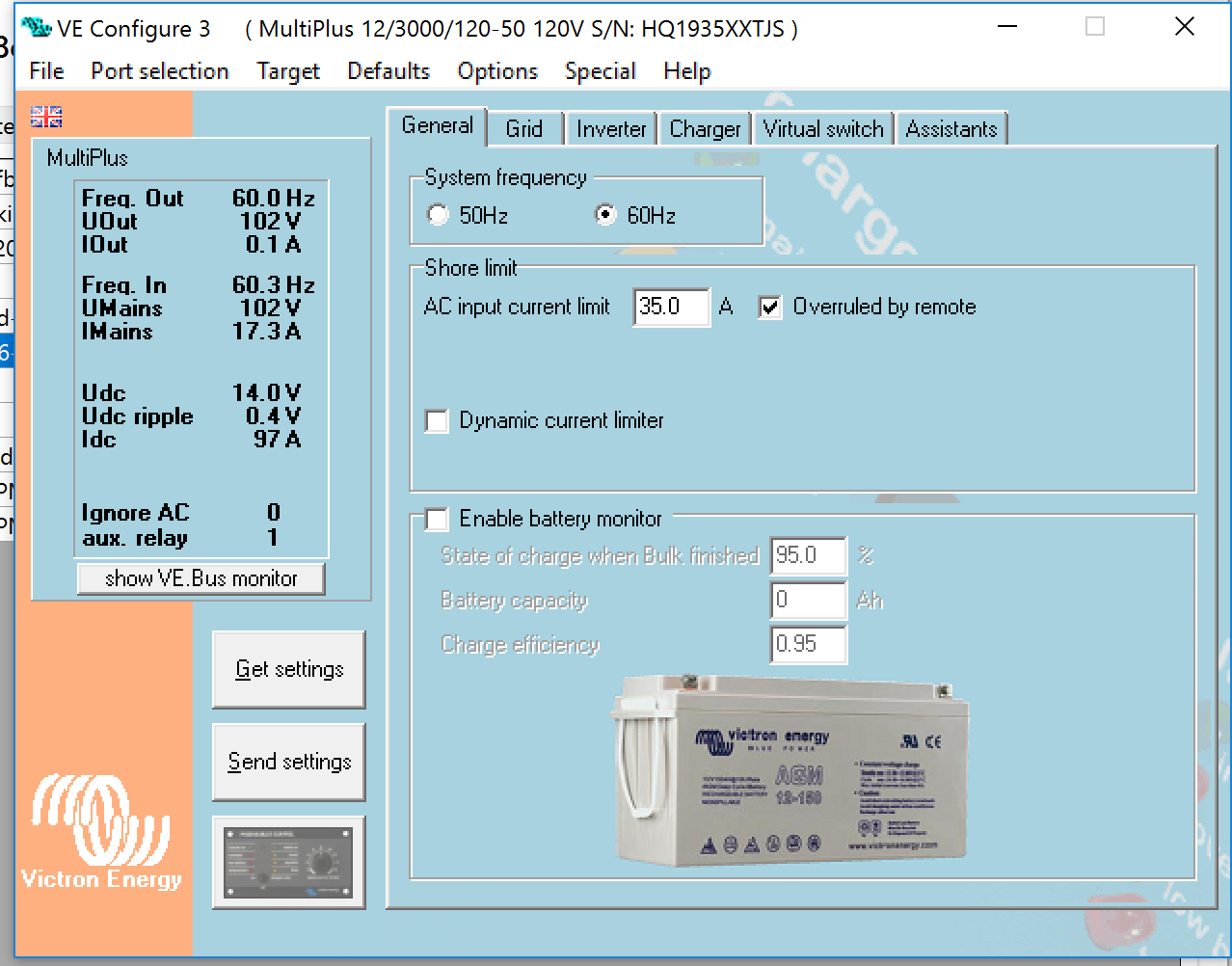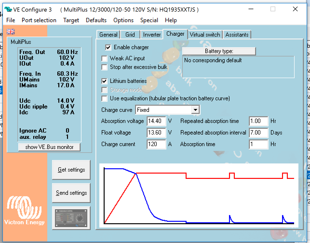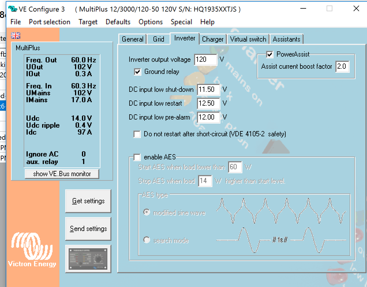 I have a Multiplus 3000 120v wired up with battle born batteries. When the system is in "bulk" mode, the AC output voltage drops pretty low (currently at 102v). It starts off at 120, then slowly drops to about 102 and the device starts buzzing louder and louder. AES is turned off. See attached screenshots.